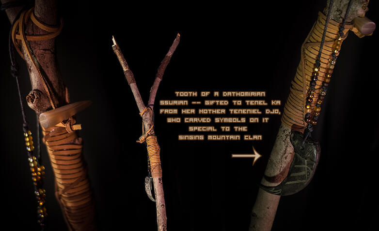 [ The first in a series of detail posts looking at items and props related to jacen solo + tenel ka in canon / costumes as well as all the crazy alternate universes this project holds. we have reasons for doing / including a lot of the weird things we do when we make costumes and other fun things for this project, so we thought we would delve into the details!thanks to Nate for these costume photos from ‘14, Bria for the kickass fishtail braids that day & my dathomirian momma, jesse, who made/carved/beaded the tooth piece on the stick and gave it to me as a gift when we cosplayed tenel ka & teneniel djo together in ‘12! ♡ ]